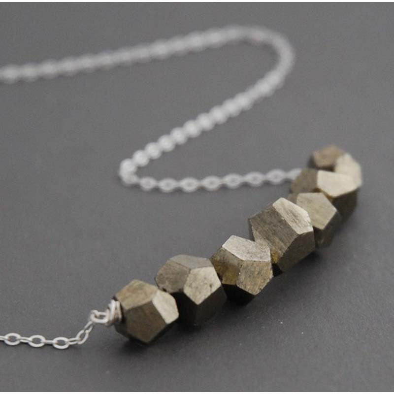 7 pyrite polyhedrons - Brassy greeny golden pyrite nuggets are simply wired onto a sterling silver chain. These nuggets of fool's gold are medium sized, about 8mm each. Fool's gold goes with all the spring colors, greens, magenta, purple, black, also looks great with neutrals and grey.